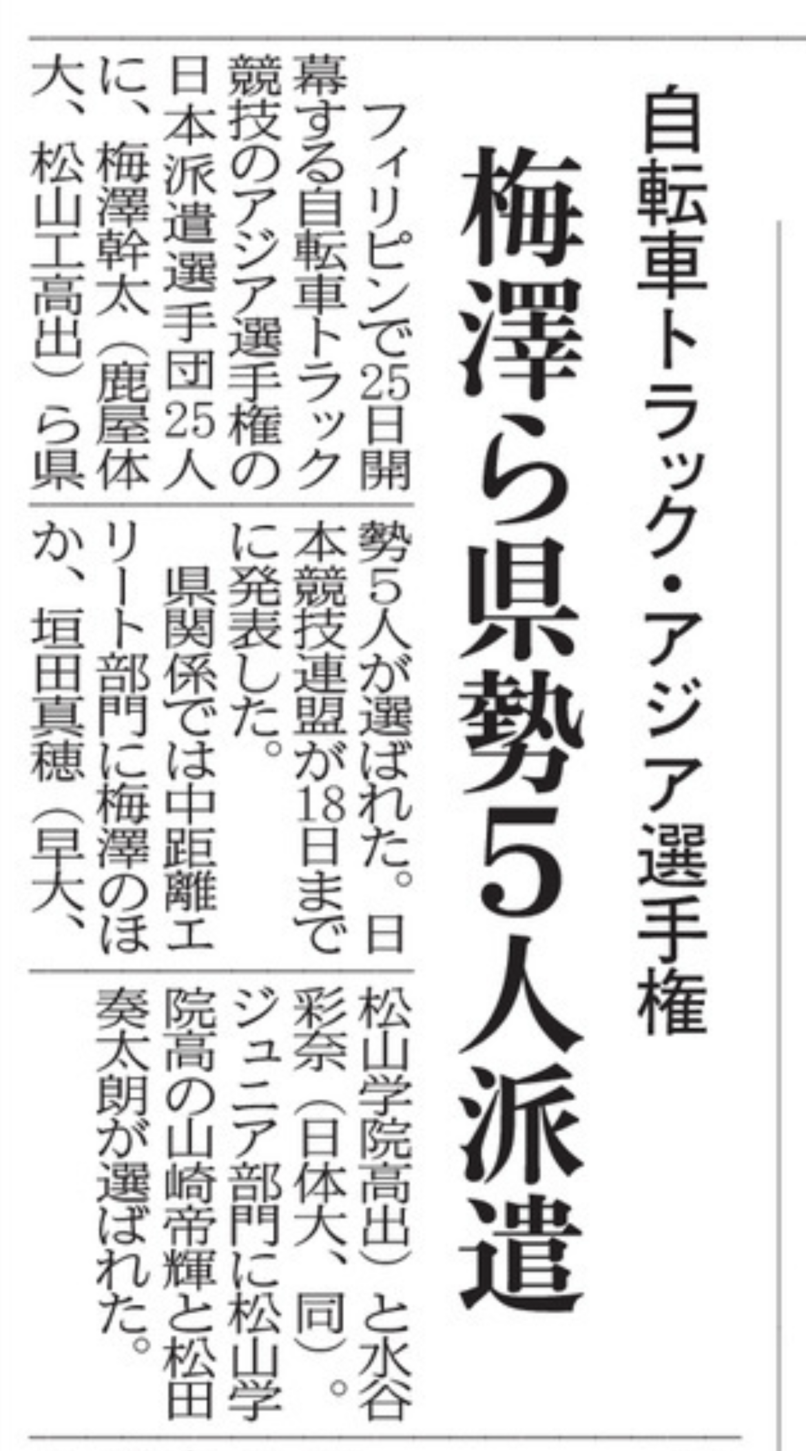 自転車トラック・アジア選手権🚲日本派遣選手☆新聞記事より